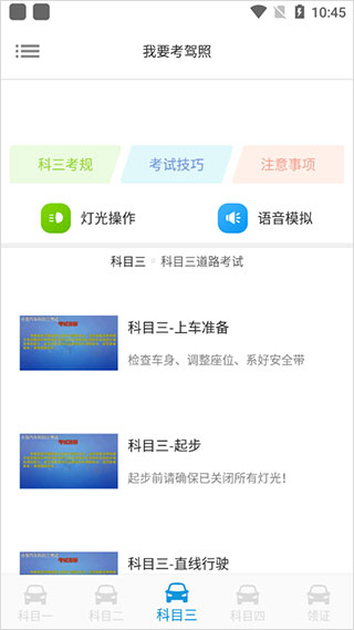 4、在科目三中,用户可以观看科目三视频讲解,同时还能进行灯光操作及语音模拟等功能。