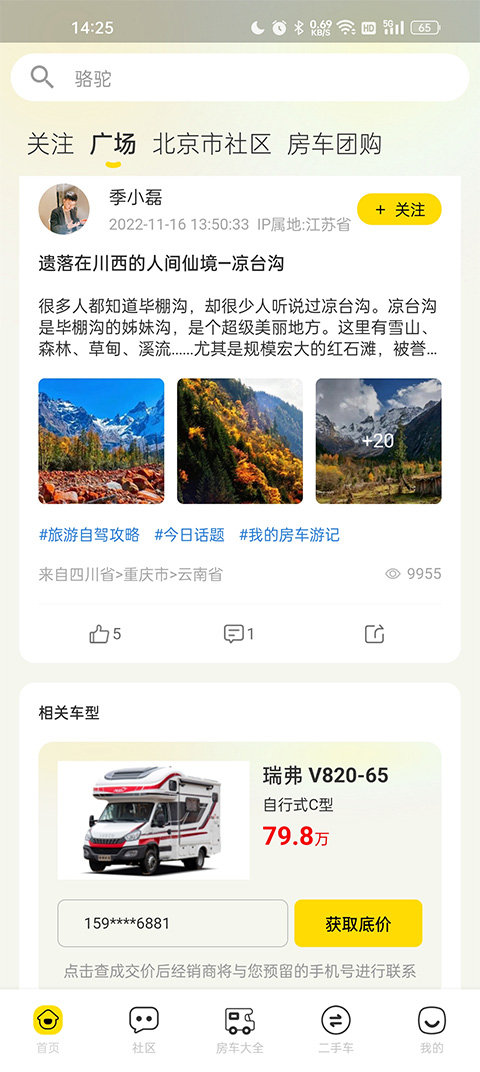 4、社群分享功能丰富用户出行体验,把美好心情和美丽景色通过房车网分享给他人;
