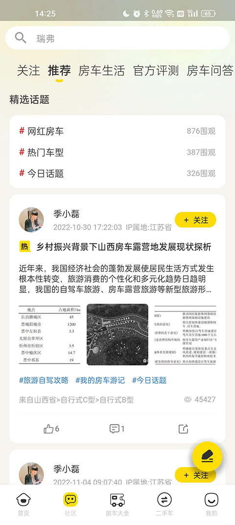 各种热门资讯以及进入话题和旅游自驾游攻略查看。