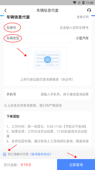 2、输入要查询车的车牌号,并上传行驶证,勾选“我已理解并同意”,最后付费查询。