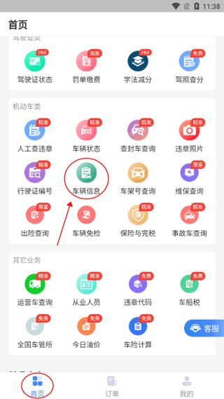 1、打开车辆查询违章app,点击“首页”,选择“车辆信息”这个功能。