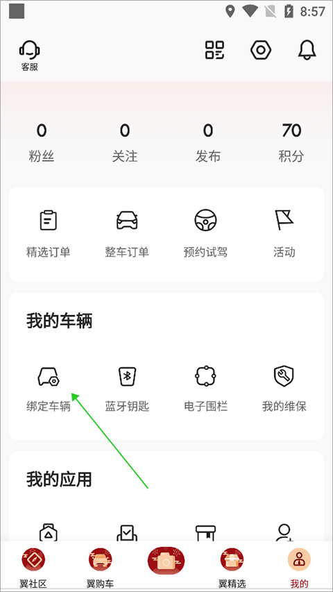 1、首先用户启动车辆后,车辆中控大屏上会显示绑定车辆的二维码,然后用户打开并注册登录凯翼汽车app后进入【我的】页面中点击【绑定车辆】