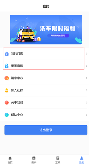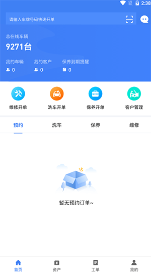 2、可以看见首页、资产、工单、我的四个模块、首页有维修开单、洗车开单、保养开单、客户管理等,还可以预约;