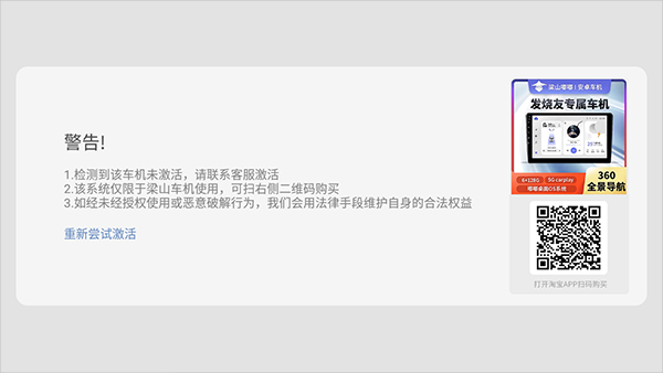 如果没有检测到嘟嘟梁山车机系统,则会在嘟嘟桌面梁山定制版打开时稍等片刻就会弹出提示框提示用户扫码联系官方客服进行付费安装。