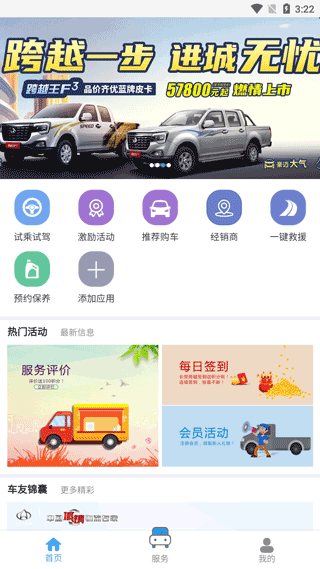 1、首先下载安装并打开长安跨越官方app,首页有激励活动、推荐购车、查找经销商等过功能;