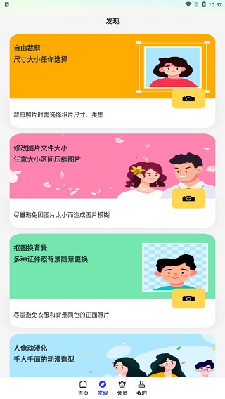我觉得这个app特别方便,因为很多时候我们可能需要不同的底色照片,但又不想专门去照相馆拍摄。有了这款软件,只需要上传一张照片,就能快速更换背景颜色,调整尺寸,并且还有美颜滤镜功能,让证件照看起来更专业、更好看。此外,软件里的“发现”功能栏还提供了很多其他实用工具,比如裁剪和抠图,非常全面。