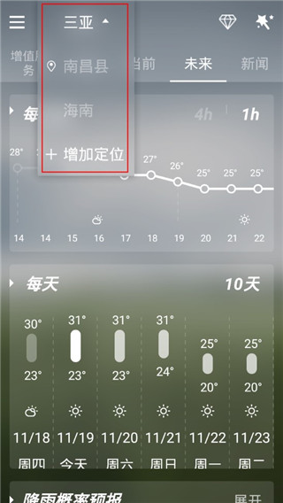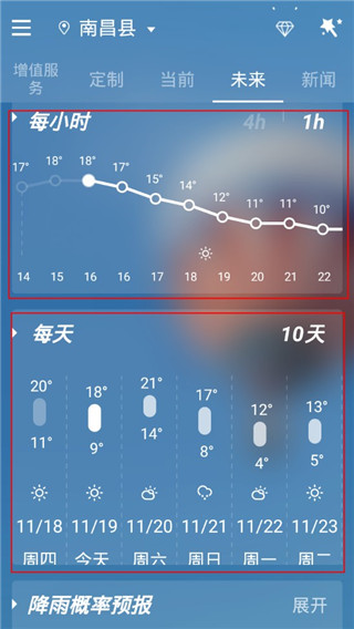 3、当我们选择未来的时候,可以查看接下来的每个小时温度变化以及接下来10天的温度变化和天气情况;