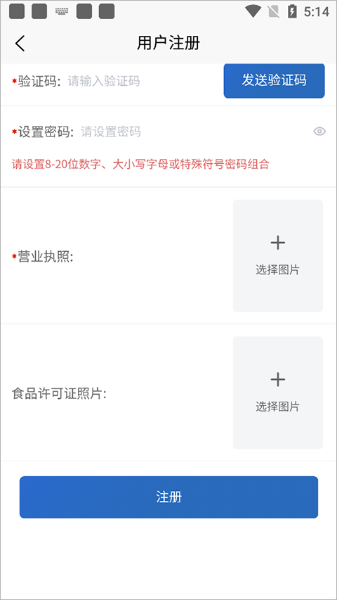 接着上传营业执照等证件照片后点击【注册】