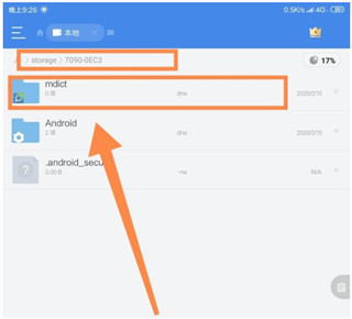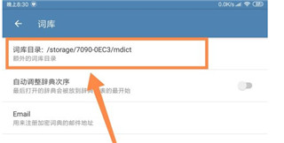 打开mdict软件,在软件的设置中找到mdict额外的词典目录,一般这个目录是手机的SD卡的目录。具体的操作如下:可以看出mdict的额外词库目录为:/storage/7090-0EC3/mdict