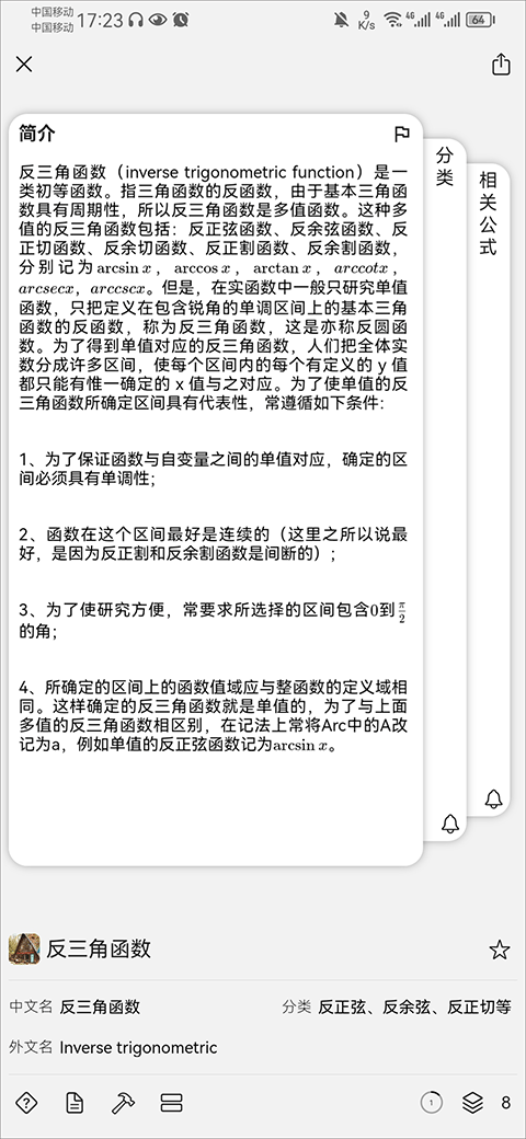 3、在快速搜索界面中有许多常见的数学公式、基本三角函数、导数、中值定理、极限等高级数学知识
