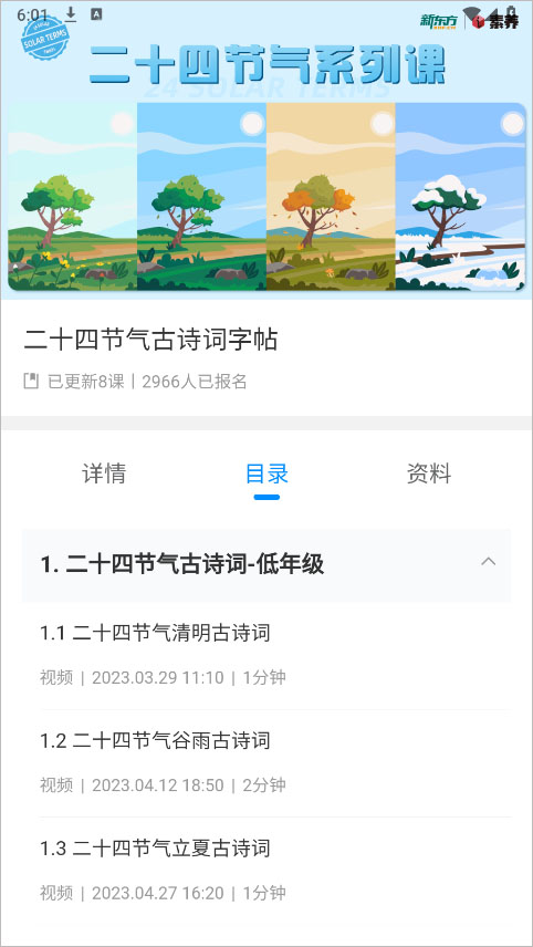 【选课报名】新东方App提供从幼儿到高中的选课服务,家长可以进行课程筛选,查看课程详情、线上报名。