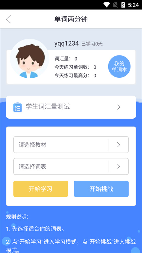 4、单词两分钟中,用户可以选择你想要的教材和词表,开始进行单词学习,还可以进入单词挑战;