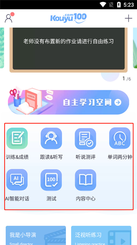1、进入软件,我们可以看到由训练/成绩、跟读/听写、听说测评、单词两分钟、ai智能对话、测试等等功能;