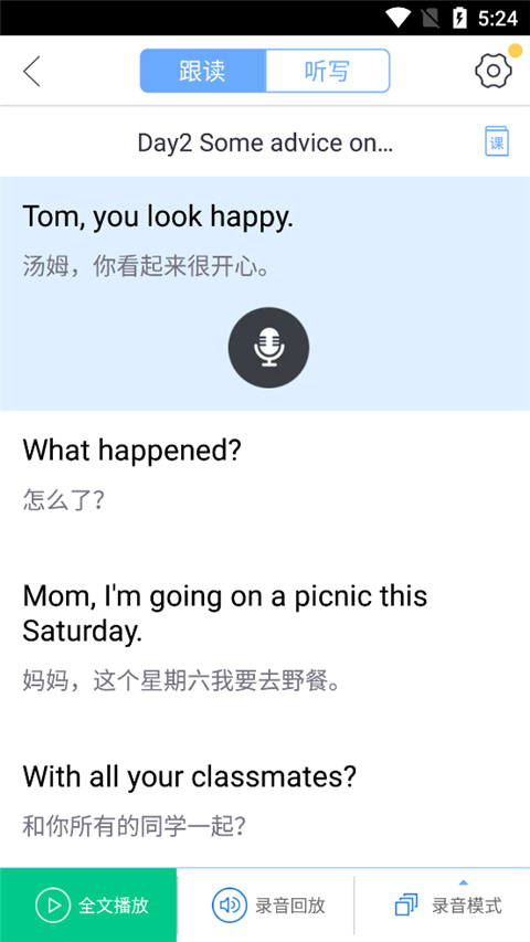 3、进入跟读/听写栏,我们可以看到由非常多的英语材料,用户可以自己开始跟读/听写学习;