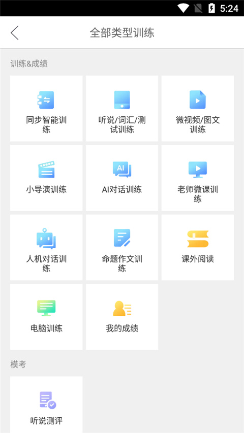 2、我们点击进入训练,它为用户提供的同步智能训练、ai对话训练、老师微课训练、人机对话训练、听说测评等功能,用户随意点击你想要的训练内容,即可开始训练学习;