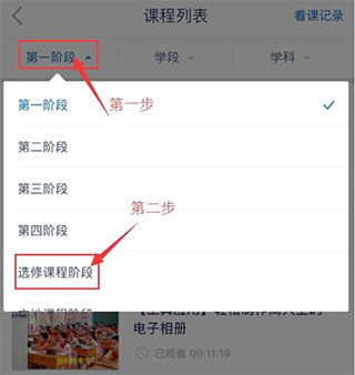 3、第一步先选择阶段,第二步点击阶段里的课程;