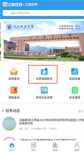 1、打开在本站下载的软件,注册登录后进入首页,我们可以看到很多功能,如成绩查询、资源填报、录取查询等等,我们点击志愿填报助手;