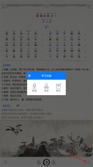 5、支持对照朗诵、逐句跟读、文本默写功能,对孩子学习国学诗词有帮助。