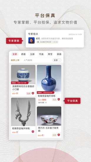 此外,用户还能申请藏品鉴定并获得专业报告,参与全民竞鉴活动还有机会赢取现金奖励。app由定海神针(北京)国际拍卖有限公司运营,团队拥有资深文博专家和古玩行家,致力于规范古玩交易,帮助用户发现藏品价值。