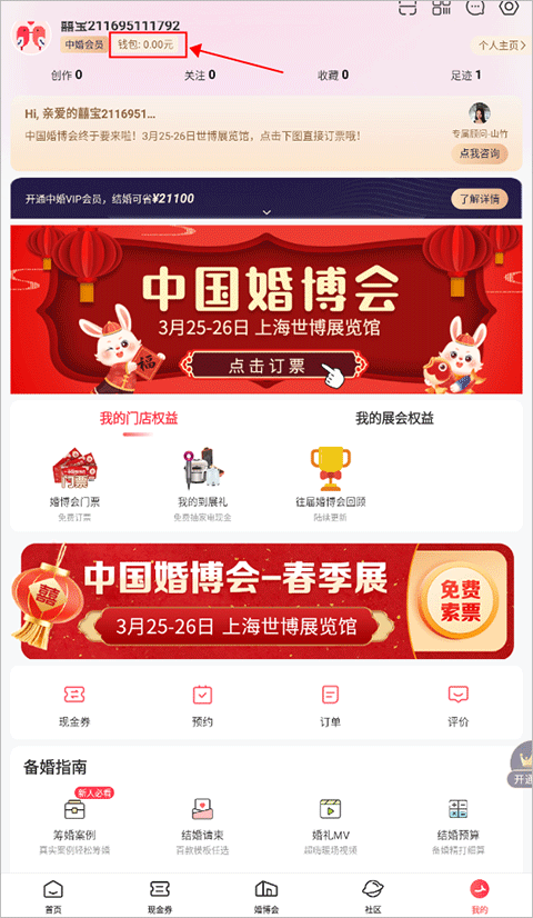1、登录婚芭莎中国婚博会app进入“我的”一“到展礼”