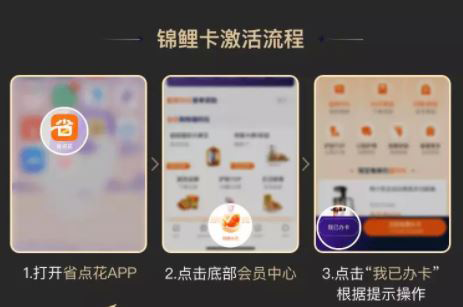 锦鲤卡激活方法收到锦鲤卡后,开始激活。下载“省点花app”-点击首页下方中部“会员中心”菜单栏-点击“我已绑卡”并根据相关提示操作