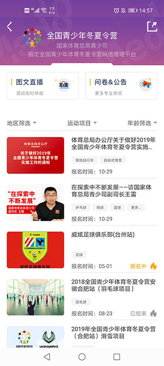如果对夏令营等活动感兴趣的话,在这款软件中也是可以找到,软件内有各种的青少年体育冬夏令营,这里网罗各类体育项目冬夏令营,足球、篮球、露营、登山、航模等应有尽有,非常丰富。