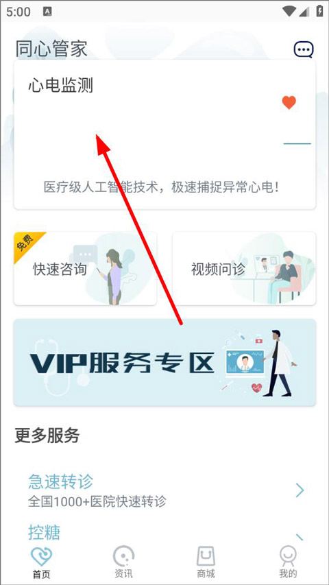 1、打开同心管家app,登录进入首页,首页有心电监测、快速咨询、视频问诊、康复管理、急速转诊等功能,点击心电监测;