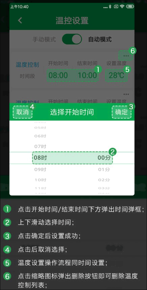 自动模式下,需要设置3段,每一段对应时间与温度,点击时间或者温度选择目标值,最后点击确认保存按钮即可,如下图。