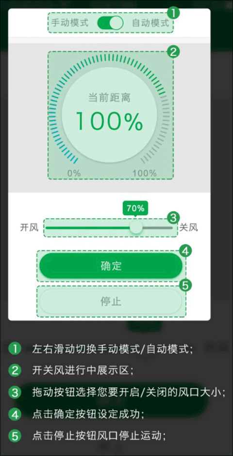 手动模式下,滑动屏幕下方的进度条,选择要调节的风口大小,然后点击确定按钮进行调节,点击停止按钮停止调节,如下图。