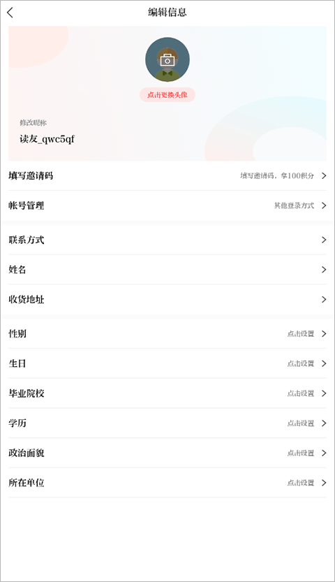 进到编辑信息界面后,在这里可以修改的内容有很多,比如说你们可以绑定你们自己的学校,也可以是填写你们政治面貌、学历还有就是所在单位等等,都是可以直接在这里进行修改调整的。