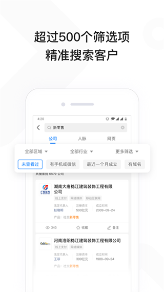2、【找客户】使用多达17个维度精准筛选企业列表,找客户,找人脉和合作伙伴