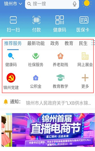 1、在本站下载安装锦州通app,在首页可以堪忧有健康吗、社保服务、养老助残、教育教学等;