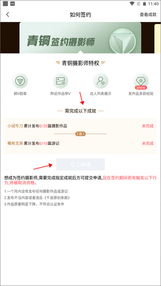 (3)完成下方的成就,如累计发布20篇摄影作品或10篇游记,当你达到相关要求之后就可以申请成为签约摄影师了。