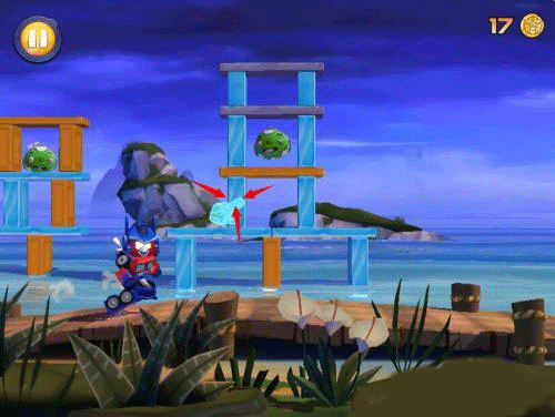 一般情况下绿猪都是在建筑物上面的,游戏前期玩家在没有升级变形金刚的时候,攻击力偏低,如果直接攻击绿猪的话,可能并不能在该屏幕跑酷过程中造成击杀。所以玩家只需要击碎屏幕红色方框“玻璃”,建筑物会倒塌,绿猪都将会葬身大海,按照冰块>木块>石块的优先顺序进行射击。