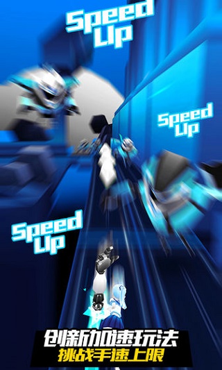 相较于很多跑酷游戏将重点放在“跑”的元素上,《战斗少女跑酷》从游戏标题就已经反映出,“战斗”才是这款游戏的核心。在面对中途出现的小丑时,我们没有闪躲的余地,即便和敌人不在同一个轨道上依然会受到攻击。所以主动出击是唯一的选择,抓准时机朝敌人的方向滑动屏幕即可,如果处于同一轨道上那么只需要向上滑动,用手中的武器将敌人“一刀两断”吧!这种主动出击的设计,在考验反应力的紧张感之上,增添了不少爽快感。尤其是当敌人密集出现的时候,左右挥舞手中武器的感觉,特别带感。不过一般情况下,游戏的速度感并不是非常强,如果你对自己的技术充满信心,并想来点更有挑战性的玩法,那么可以手动进行加速——只要不断的向下滑动屏幕,就可以不断的加速再加速,超越极限享受极致快感。