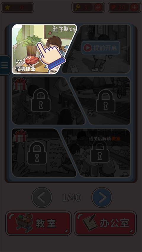 第一关:点击黑板上的新学期大扫除,点击地上的历史作业本,点击桌子上的两份作业(点其中一个即可),点击英语作业本,点击放在书包里的数学作业本。