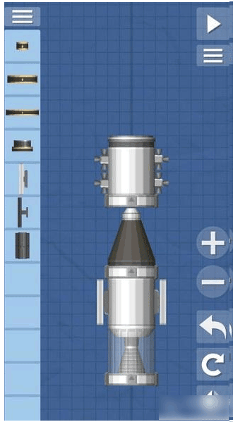 1、首先制作一个中等的燃料箱,然后下方加一个分离器,加上控制室和降落伞;