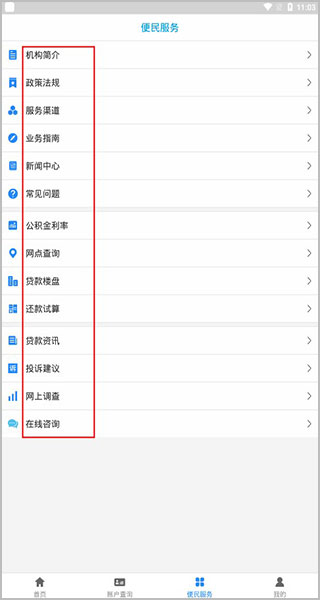 4、右划进入便民服务,这里有机构简介、业务指南等等多项功能。