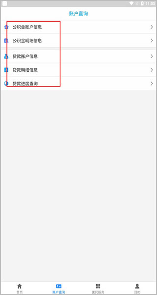 3、在首页右划进入账户查询,这里可以查询公积金账户信息等;