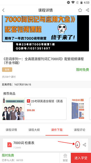 2、进入课程界面后,点击课件下载的下载小图标,即可进行下载。