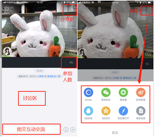 正式开始直播,可点击右上角分享到社交圈,吸引更多人收听;