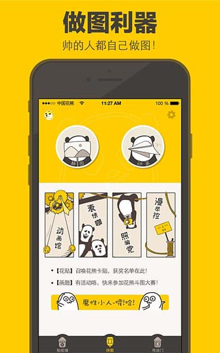 花熊app是目前安卓平台上最好玩的贴纸拼图软件,该软件由潘哒进化而来,主打用图片聊天,同时偏向于社交互动属性,新增了元素搜索,元素复制,目前已有10000+个元素,可以为用户提供快速的制图功能。新本的花熊软件同时还新增最走心的功能:玩动画,用户可以自己做动画了,只需选好贴纸,加文字,就可以将好玩的动画制作出来,适合爱玩贴纸的朋友使用。花熊app其实还有一个更有趣的玩法,那就是画题,简单的说就是用户可以一起参与的聊天主题,只不过在花熊是用拼图来交流的。有四种玩法:图开心,也就是随便画。玩花活,是一种有限制要求的话题模板玩法。神补刀也就是对同一副画进行不同吐槽,吐槽星人最爱,是秀脑洞的好机会。还有一个私房画功能,这个就偏个人性质,可以拼故事,或者拼心情日记。