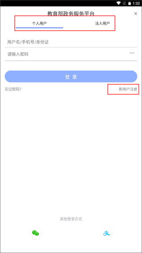 2、跳转到登录界面后,有两种登录方式:个人用户和法人用户,点击右下角的新用户注册。