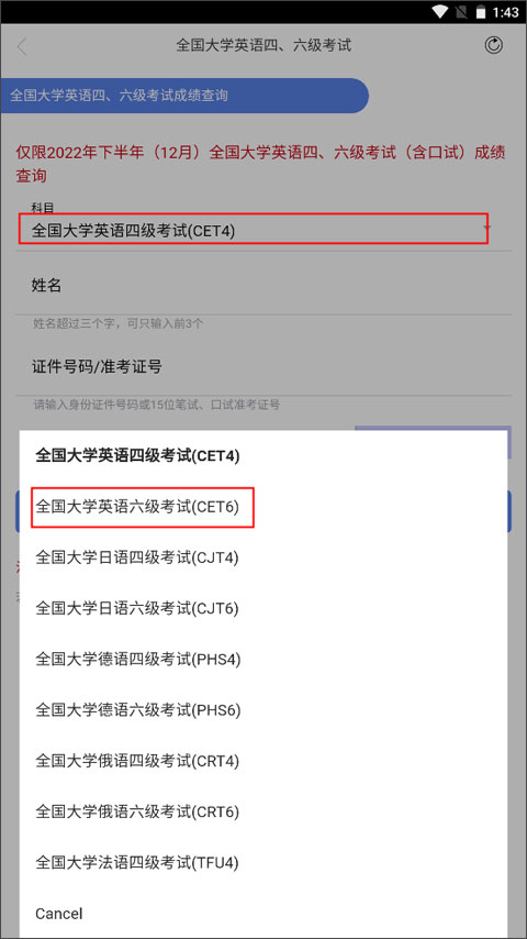 3、接下来根据下拉来选择查询的科目,如英语、日语、德语等。