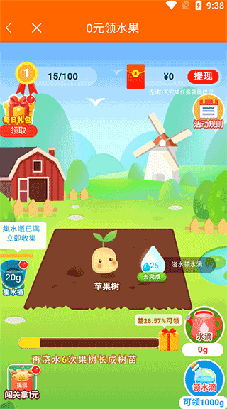 3、点击主界面上方的绿色方框内按钮进入领水果界面;