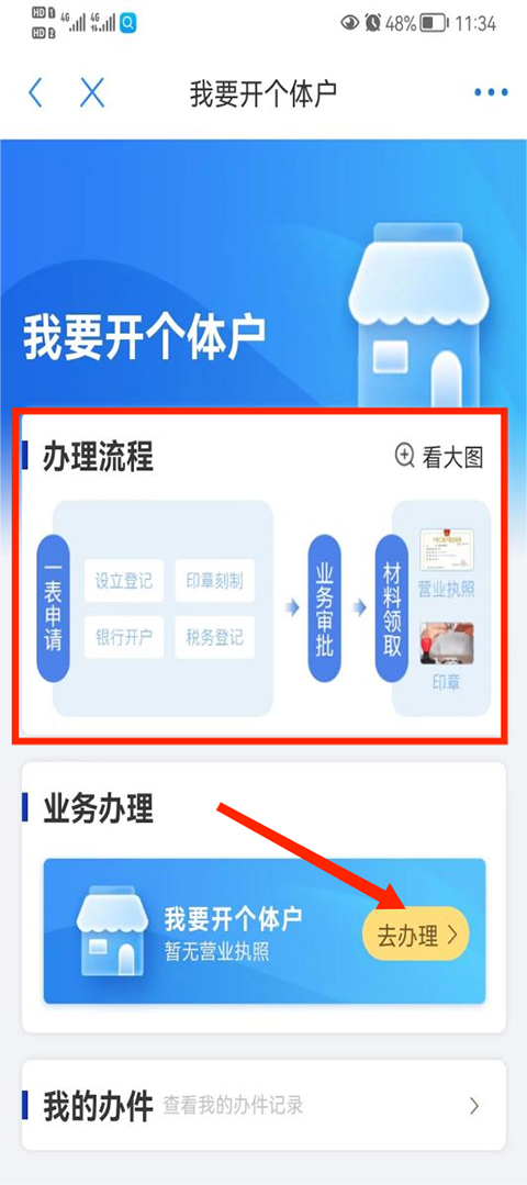 3、进入【我要开个体户】界面,用户可在上方了解详细的办理流程,之后选择【去办理】选项,