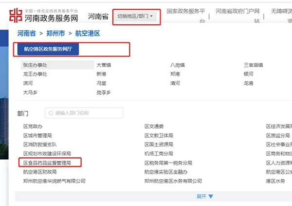 1、打开郑州政务服务网,点击【切换地区/部门】选项,选择公司所在地区,这里以【航空港区】为例,选择下方【区食品药品监督管理局】选项,
