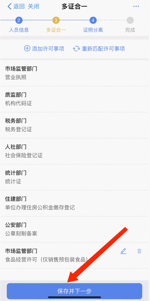 4、进入【多证合一】界面,填写完成后选择下方【保存并下一步】选项,等待审核完成后就可以成功办理营业执照了。