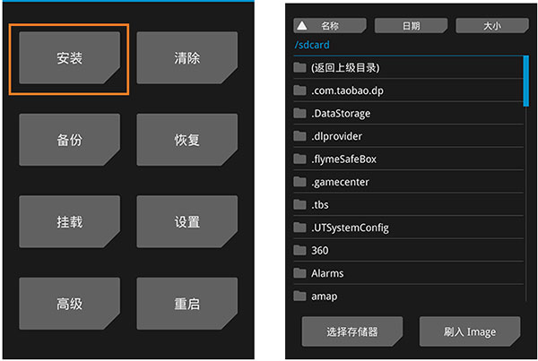 2、接着手机关机按住音量上+开机键进入recovery,点击install,然后就找到supersu卡刷包点击