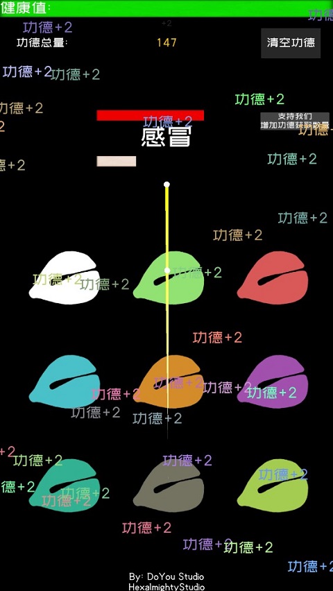 在顶部绿色代表了健康值,随时间健康值会持续下降,倘若降低数值为0则条件失败。反之,持续敲木鱼可以稳定健康值的状态,在游戏图中红色代表了可能出现的身体“灾害”,连续敲击木鱼可以消减擦伤、感冒、刀伤等各种意外。